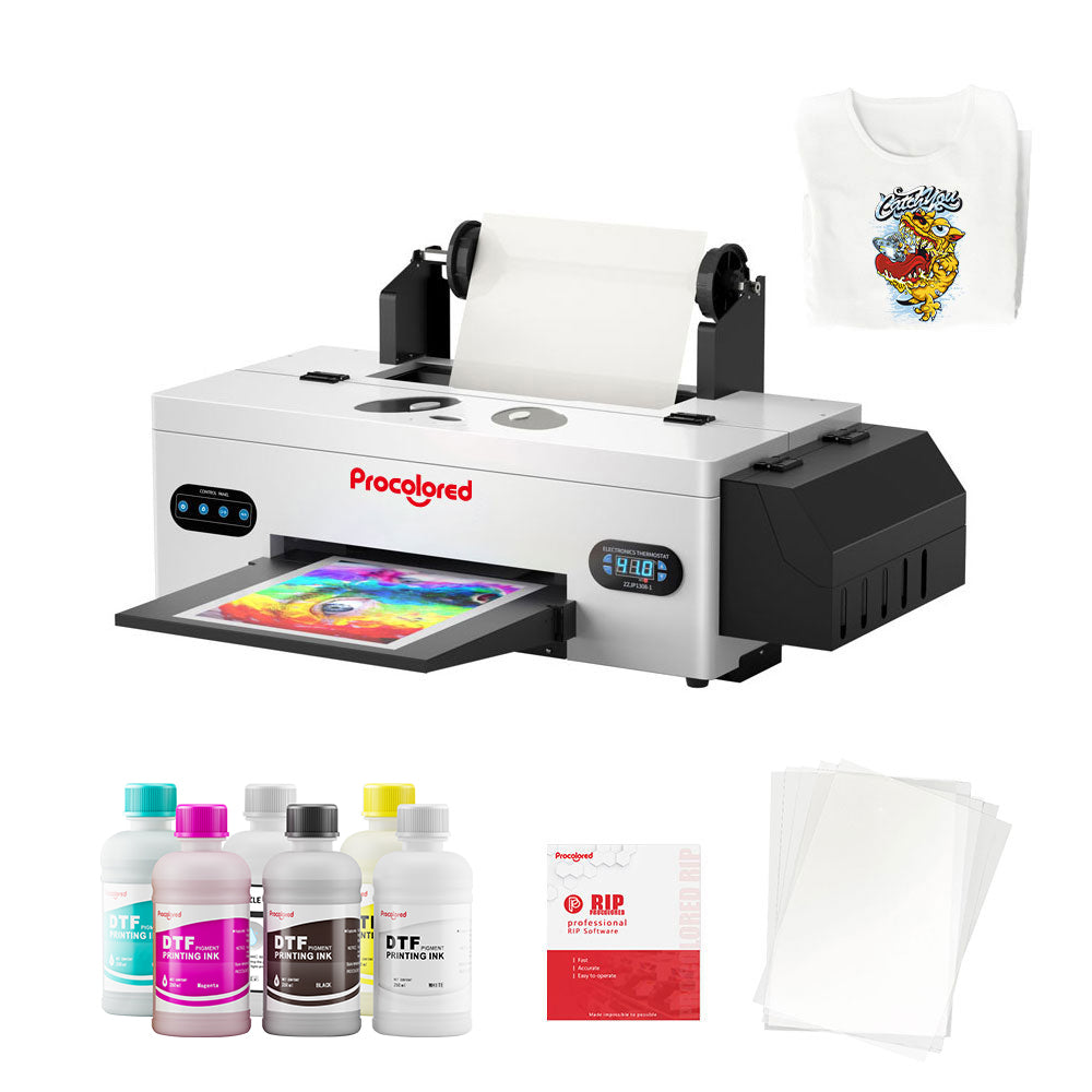Procolored R1390\L1800 DTF printer (Direct to Film printer) is a high-quality and easy-to-use film transfer printer. It delivers industrial-print-quality output at impressive production speeds, and it's an ideal t-shirt printer with the capability of printing on multiple fabric substrates (cotton, poly, blends and more) and different fabric colors (even for fabric in black).