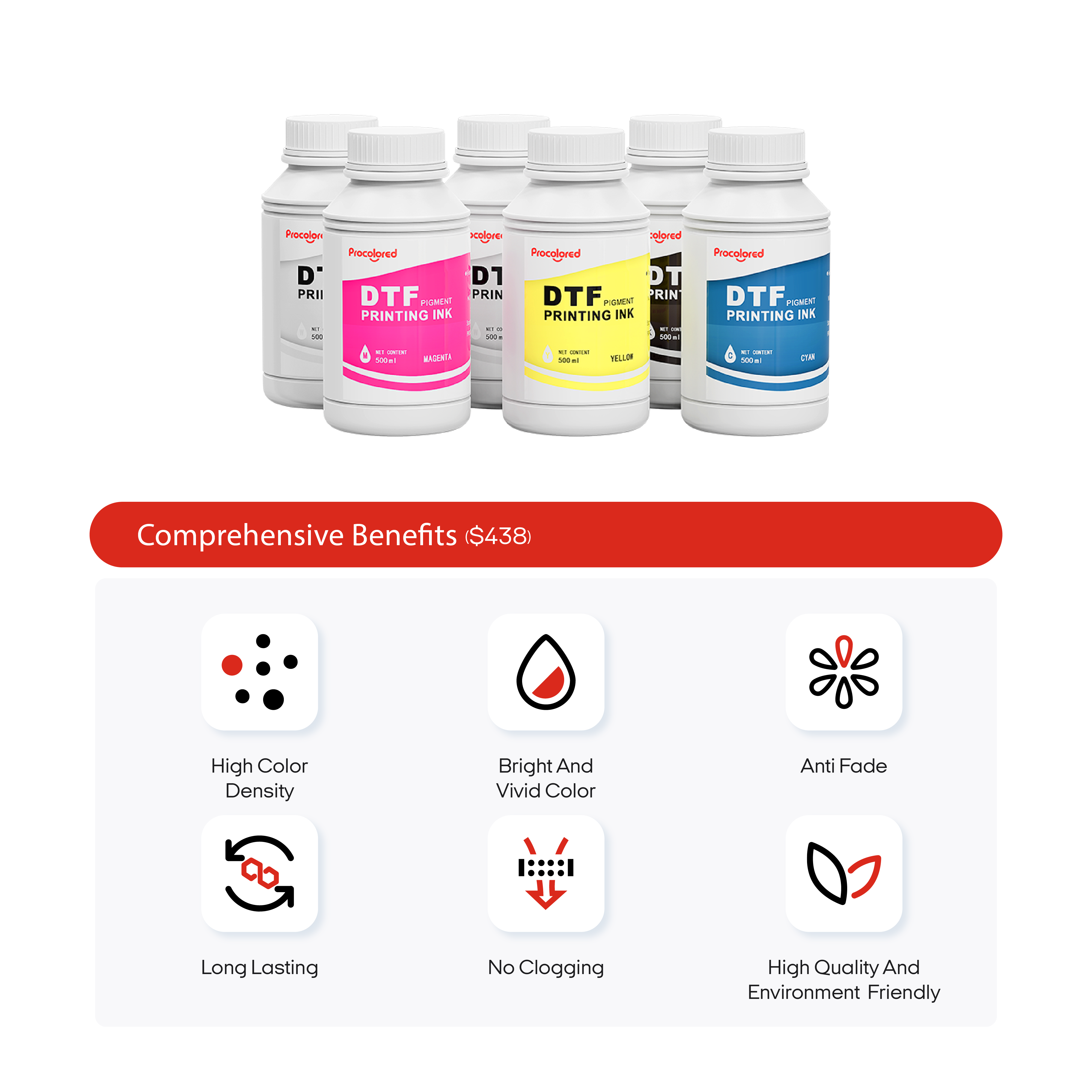 With specific chemical components, viscosity setting and drying speed, Procolored DTF inks are designed to perfectly fit Procolored films and printers.